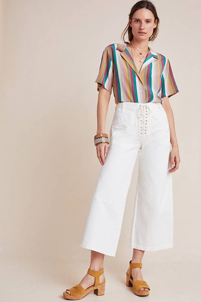 وأوضحت المجلة المعنية بالموضة والجمال أن الجينز الأبيض ذا الأرجل الواسعة يمتاز بتنوع إمكانيات التنسيق؛ حيث يمكن الحصول على إطلالة كاجوال متحررة من خلال تنسيقه مع تانك توب أو قميص أكبر من المقاس "Oversized".