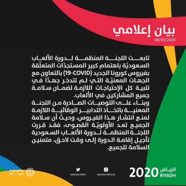قررت اللجنة المنظمة لدورة الألعاب السعودية تأجيل الدورة حتى إشعار آخر، بناء على توصيات اللجنة المعنية بمتابعة انتشار فيروس كورونا الجديد " COVID-19" ، وحرصا على سلامة الجميع.