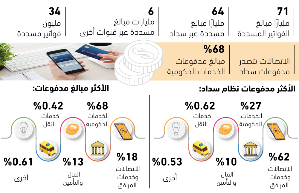 تصدرت الاتصالات وخدمات المرافق مدفوعات نظام سداد حسب القطاعات، حيث بلغ إجمالي المدفوعات 20.785.485 مليون بـ62%، وحلت الخدمات الحكومية ثانيًا، بإجمالي 8.946.584 مليونا بـ27%، والمال والتأمين وخدمات الأعمال ثالثًا، بإجمالي 3.355.503 ملايين بـ10%، وخدمات النقل رابعًا، بإجمالي 212.259 ألف بـ0.62%، وأخرى خامسًا، بإجمالي 181.740 ألف بـ0.53%.
