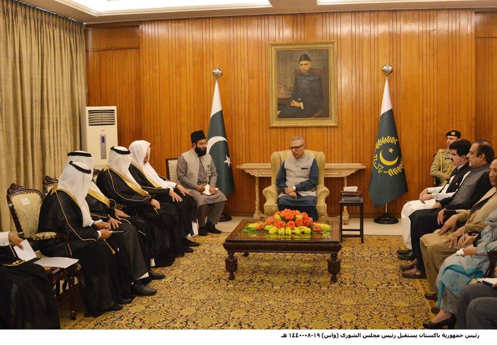 استقبل الرئيس الباكستاني الدكتور عارف علوي بالقصر الرئاسي بإسلام آباد أمس، رئيس مجلس الشورى الشيخ الدكتور عبدالله بن محمد بن إبراهيم آل الشيخ، وذلك في إطار الزيارة الرسمية التي يقوم بها للجمهورية.