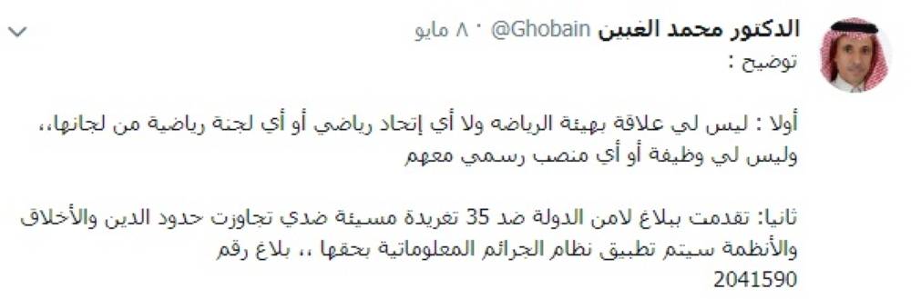 بدوره، كتب الغبين عبر تغريدة قائلا «ليس لي علاقة بهيئة الرياضة ولا أي اتحاد رياضي أو أي لجنة رياضية من لجانها، وليس لي وظيفة أو أي منصب رسمي معهم، تقدمت ببلاغ لأمن الدولة ضد 35 تغريدة مسيئة ضدي تجاوزت حدود الدين والأخلاق والأنظمة سيتم تطبيق نظام الجرائم المعلوماتية بحقها».