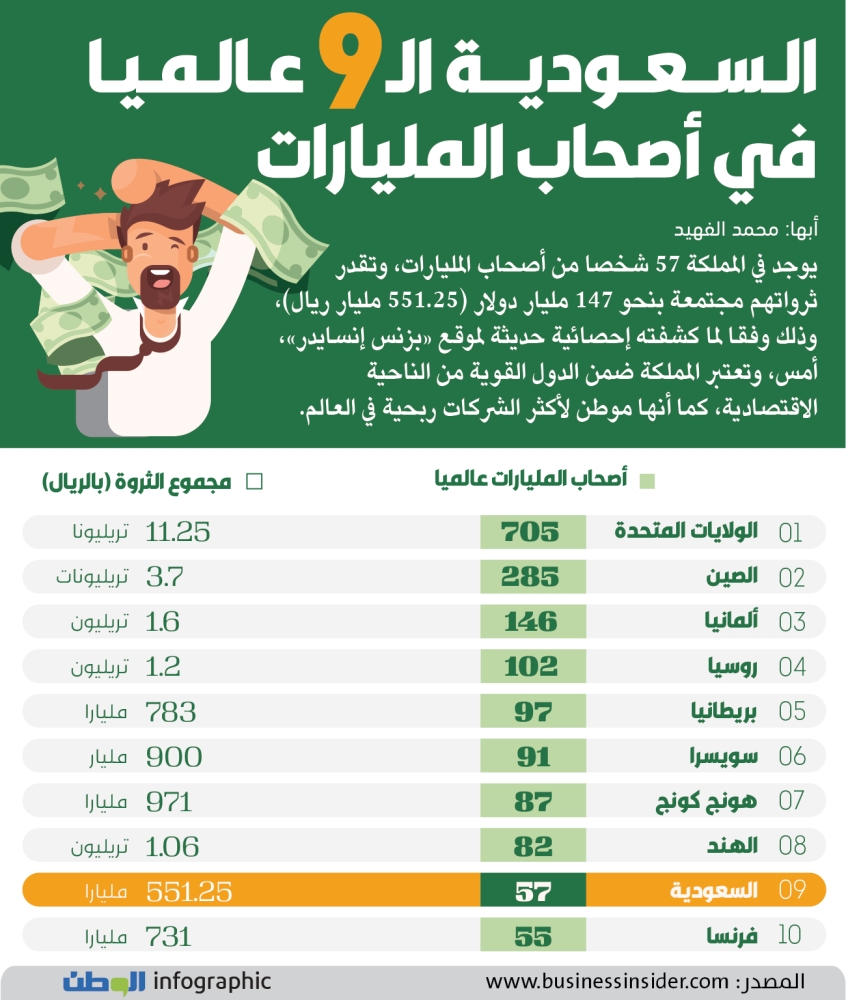 مجموع الثروة (بالريال) 1. الولايات المتحدة: 705 11.25 تريليونا 2. الصين: 285 3.7 تريليونات 3. ألمانيا: 146 1.6 تريليون 4. روسيا: 102 1.2 تريليون 5. بريطانيا: 97.783 مليارا 6. سويسرا: 91 900 مليار 7. هونج كونج: 87 971 مليارا 8. الهند: 82 1.06 تريليون 9. السعودية: 57 551.25 مليارا 10. فرنسا: 55 731 مليارا
