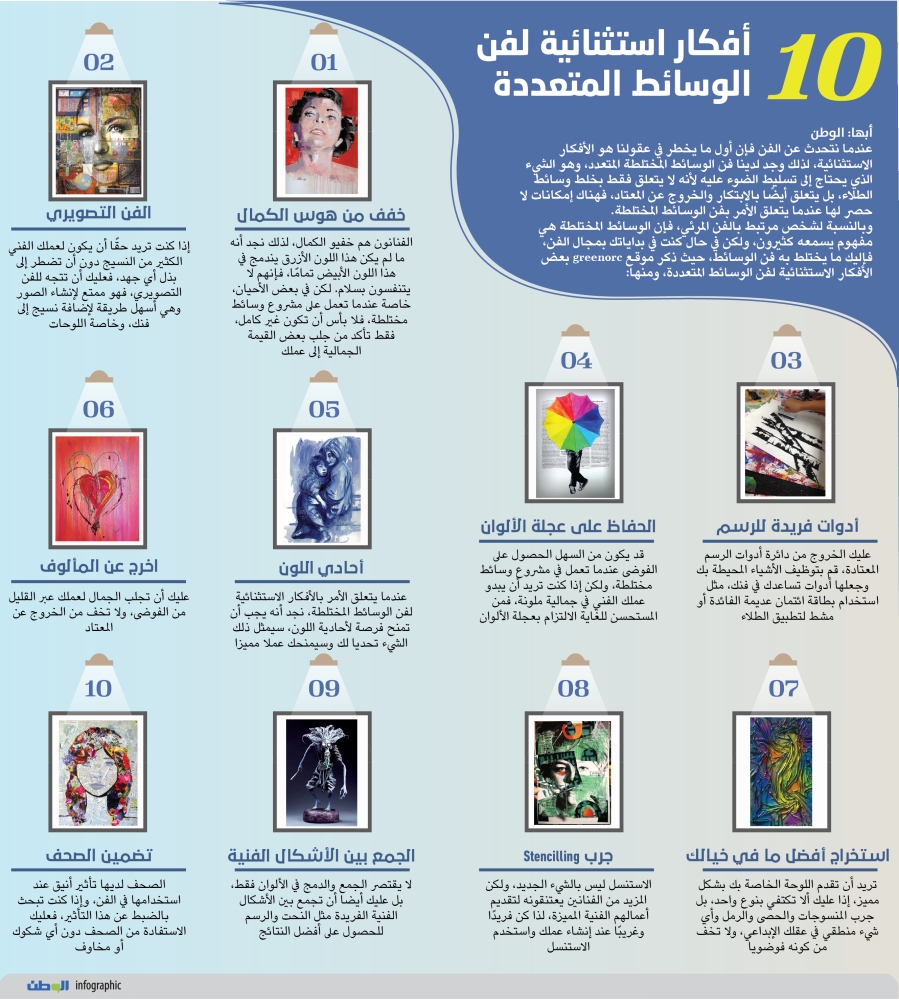 8- الجمع بين الأشكال الفنية لا يقتصر الجمع والدمج في الألوان فقط، بل عليك أيضا أن تجمع بين الأشكال الفنية الفريدة مثل النحت والرسم للحصول على أفضل النتائج.