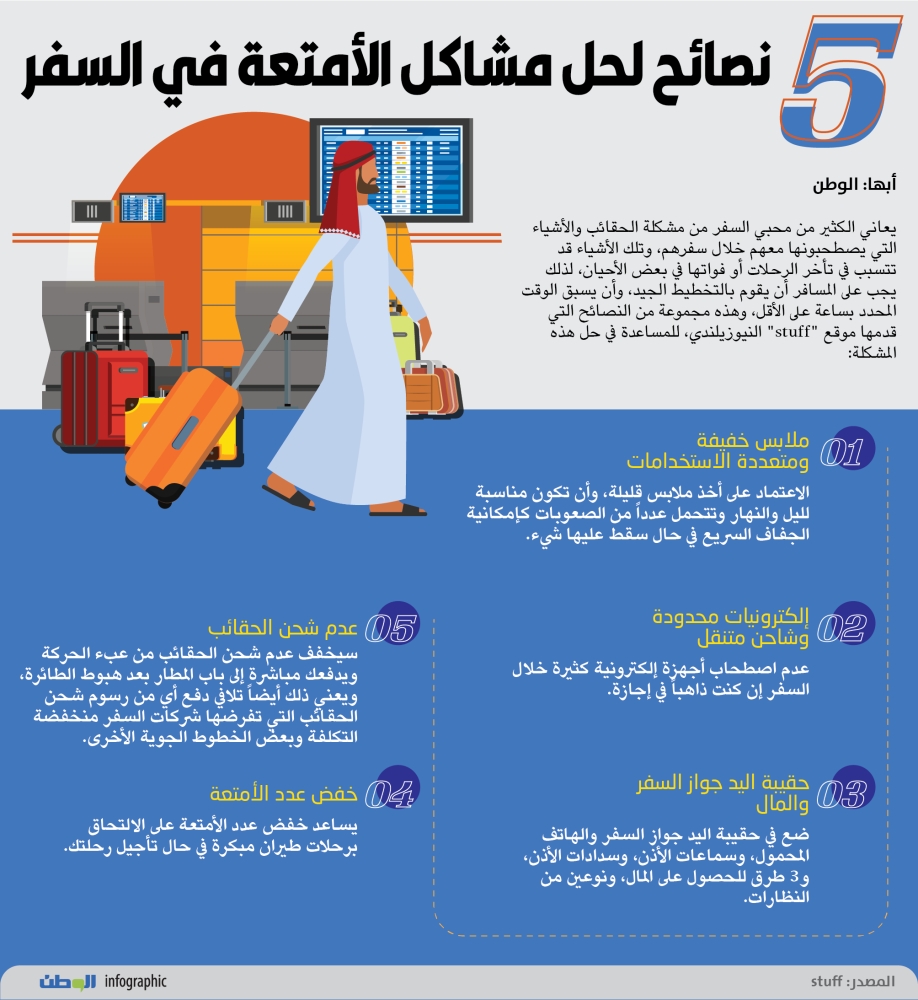 5- خفض عدد الأمتعة يساعد خفض عدد الأمتعة على الالتحاق برحلات طيران مبكرة في حال تأجيل رحلتك.