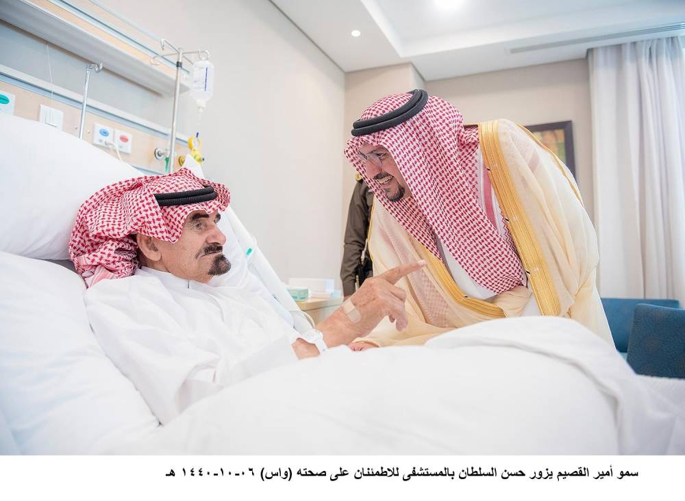 زار أمير منطقة القصيم الأمير الدكتور فيصل بن مشعل، أمس، محافظ رياض الخبراء السابق حسن السلطان، في المستشفى الذي يرقد فيه، داعيا الله العلي القدير أن يَمُنّ عليه بالشفاء العاجل.