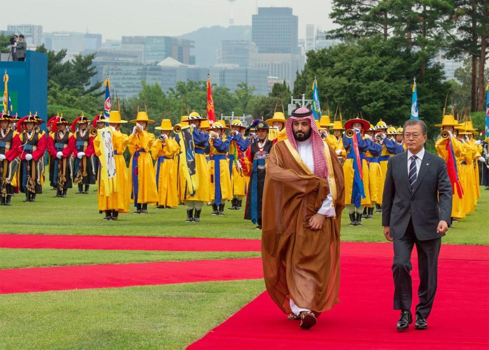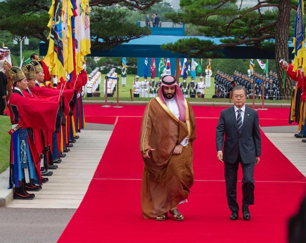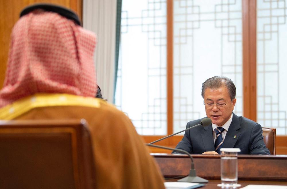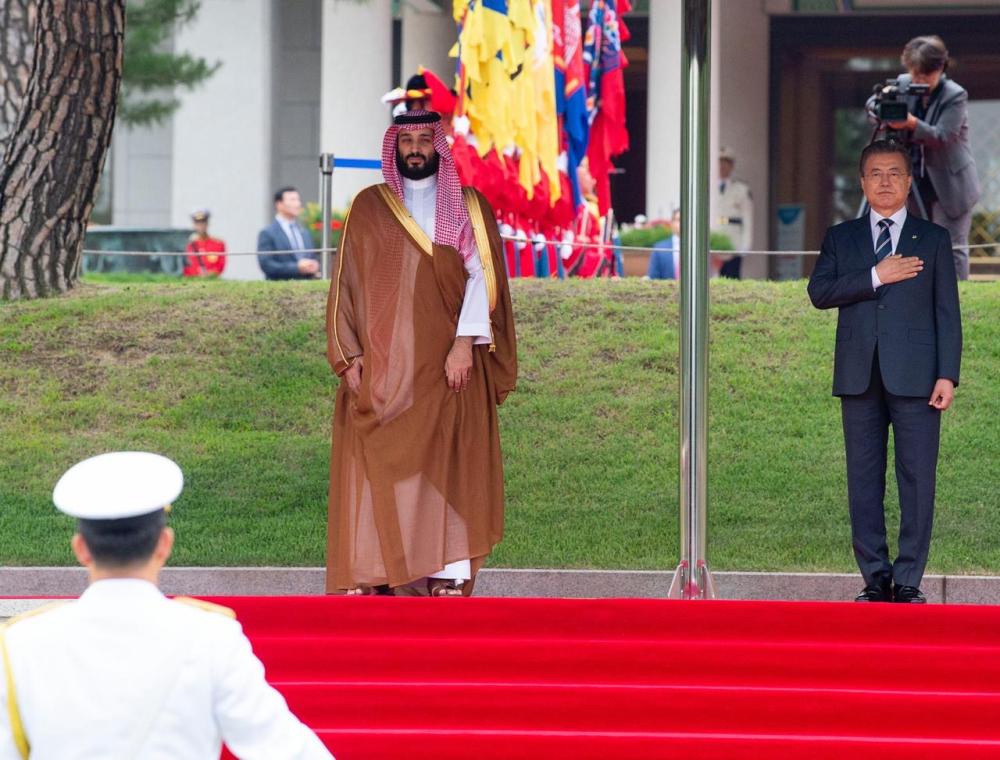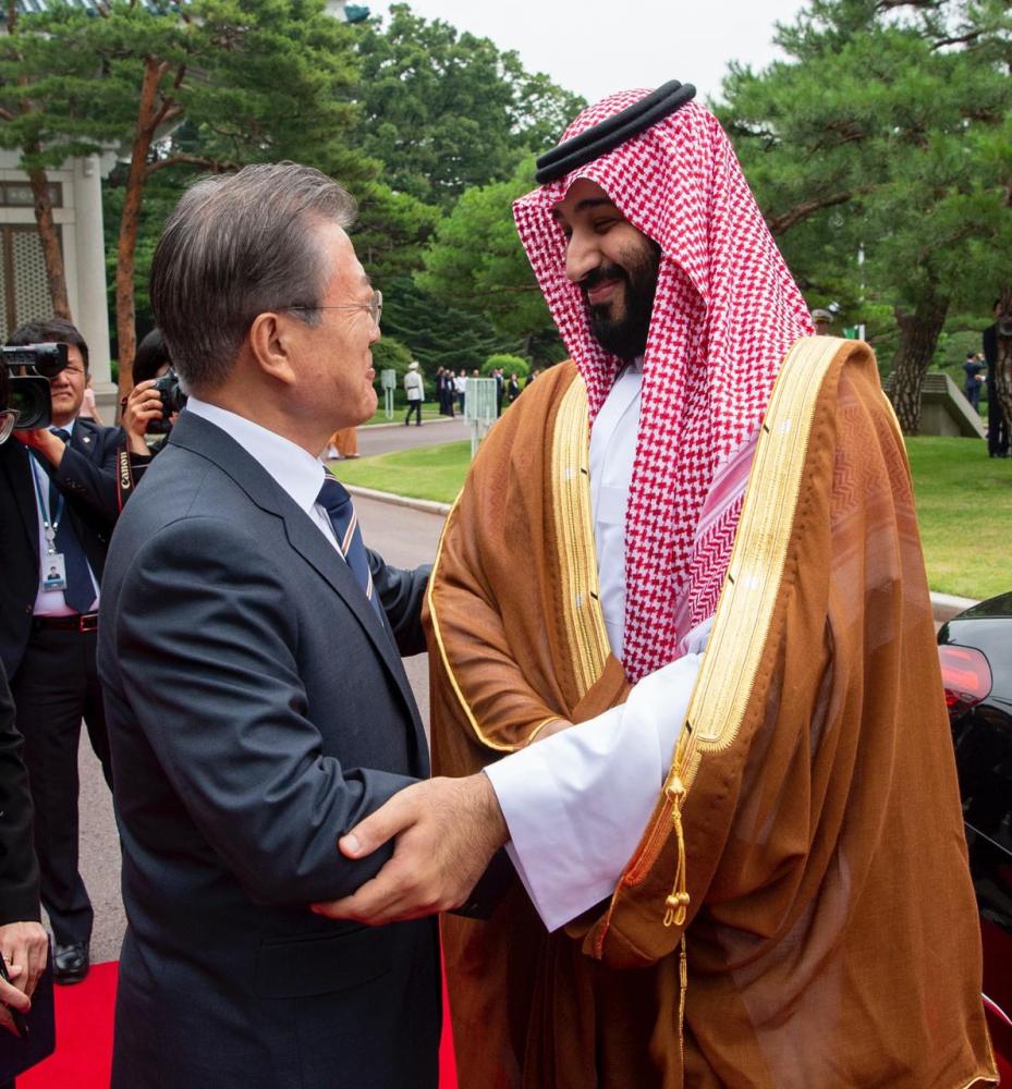 من جانبه، حمل الرئيس الكوري، ولي العهد نقل تحياته وتقديره لخادم الحرمين الشريفين الملك سلمان بن عبد العزيز، مرحبا بسموه في زيارته الحالية التي تعد الأولى لكوريا، وأشار مون جاي إن، إلى علاقات الصداقة التاريخية بين البلدين منذ بداية العلاقات الدبلوماسية بينهما مؤكدا أن المملكة دولة رئيسة في الشرق الأوسط، وحريصة على تطوير وتعزيز التعاون الاقتصادي والاستثماري بين البلدين، وتطرق فخامة الرئيس الكوري إلى أهمية زيارة سمو ولي العهد الحالية في تطوير التعاون بين المملكة وكوريا في مختلف المجالات، منوها في هذا الصدد برؤية المملكة 2030 وأهدافها الطموحة في مختلف المجالات.