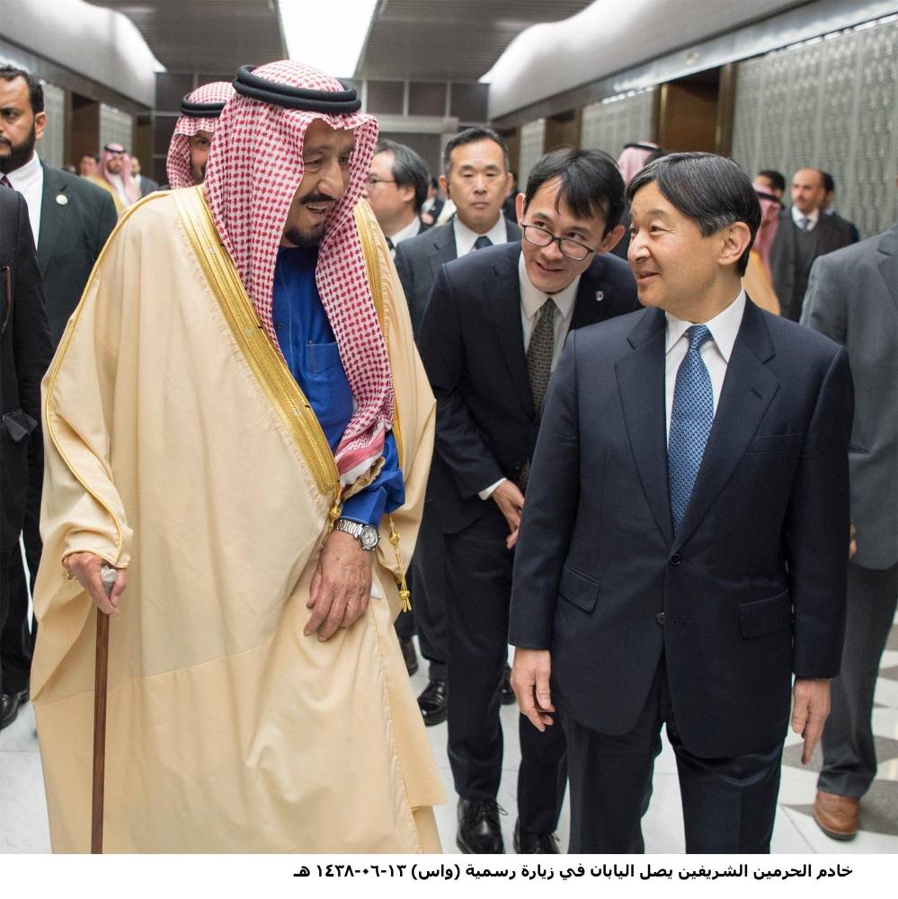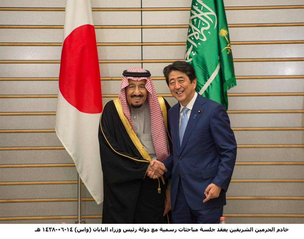 2014 الملك سلمان بن عبدالعزيز، يزور اليابان ويلتقي بالإمبراطور أكيهيتو، ورئيس الوزراء شينزو آبي.