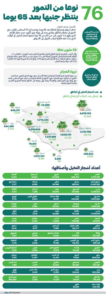 وأكد الرئيس التنفيذي للمركز الوطني للنخيل والتمور الدكتور محمد النويران، لـ«الوطن»، أن الأرقام الإحصائية لإجمالي التمور في المملكة تقدر بـ 1.3 مليون طن من 28.5 مليون نخلة موزعة في مختلف مناطق المملكة، نسبة الأشجار المثمرة فيها 79%، وتبلغ المساحة المزروعة فيها 107 هكتارات لـ123 ألف حيازة زراعية للنخيل.