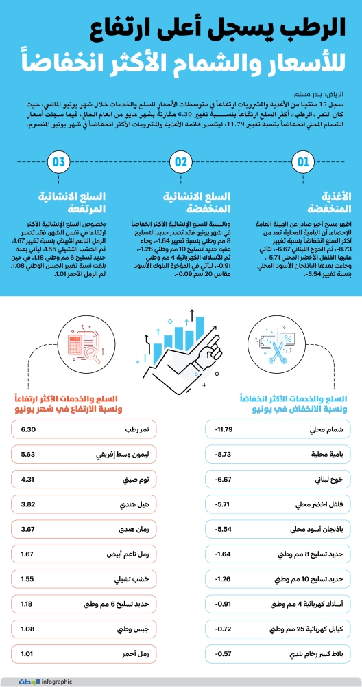 السلع والخدمات الأكثر ارتفاعاً ونسبة الارتفاع في شهر يونيو:-