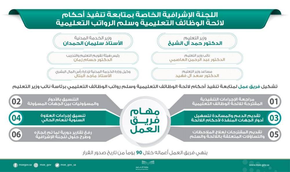وضمت اللجنة الإشرافية وزير الخدمة المدنية سليمان بن عبد الله الحمدان، ونائب وزير التعليم د. عبد الرحمن بن محمد العاصمي، ورئيس هيئة تقويم التعليم والتدريب الدكتور حسام بن عبد الوهاب زمان، ومساعد وزير التعليم د. سعد بن سعود آل فهيد، ووكيل وزارة الخدمة المدنية لإدارة رأس المال البشري الأستاذ ماجد بن عبد العزيز البتال، فيما يرأس نائب وزير التعليم الفريق المشترك الخاص بمتابعة تنفيذ أحكام لائحة الوظائف التعليمية وسلم رواتب الوظائف التعلمية.