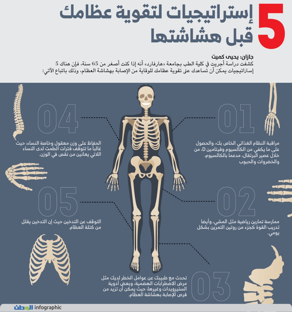 كشفت دراسة أجريت في كلية الطب بجامعة «هارفارد» أنه إذا كنت أصغر من 65 سنة، فإن هناك 5 استراتيجيات يمكن أن تساعدك على تقوية عظامك للوقاية من الإصابة بهشاشة العظام، وذلك باتباع الآتي: