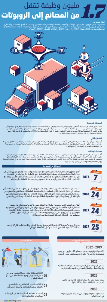 أكد تقرير صادر عن المنتدى الاقتصادي العالمي حمل عنوان "مستقبل الوظائف لعام 2018" أن سوق العمل سيفقد على مستوى العالم نحو 75 مليون وظيفة تقليدية لصالح «الروبوتات»، في حين سيستحدث الاعتماد على الروبوتات 133 مليون فرصة عمل حديثة، مشيرا إلى أن الشركات ستضطر إلى تقسيم مهام العمل بين الإنسان والآلات. وذكر التقرير، أنه اعتبارا من 2022 ستحل الروبوتات محل البشر بسرعة في مجالات المحاسبة وإدارة العملاء والقطاع الصناعي والبريد والسكرتارية.