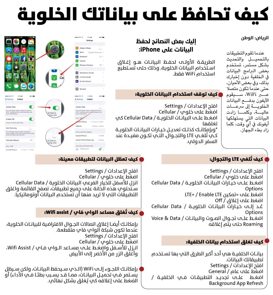 *وبإمكانك كذلك تعديل خيارات البيانات الخلوية كي تُلغي LTE والتجوال، التي تكون مفيدة عند السفر الدولي.