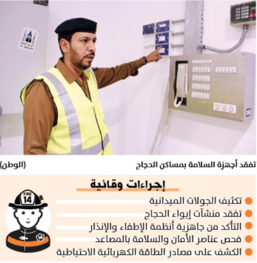 وكثّفت قوات الدفاع المدني بالعاصمة المقدسة، ممثلة في إدارة السلامة، جولاتها الميدانية خلال موسم الحج، وتفقدت منشآت إيواء الحجاج بالمنطقة المركزية بالعاصمة المقدسة، بهدف التأكد من جاهزية أنظمة إطفاء الحريق والرش الآلي وأنظمة الإنذار، كما شملت الجولات الميدانية تفقد فرق الإشراف الوقائي، بحضور مختصي السلامة في المنشآت، وفحص عناصر الأمان والسلامة بالمصاعد والسلالم الكهربائية، والتأكد من جاهزية وفعالية مضخات الحريق وأنظمة الإطفاء التلقائية واليدوية، وشهدت الجولة الكشف على مصادر الطاقة الكهربائية الاحتياطية داخل الفنادق، للتأكد من عملها في حال انقطاع التيار الكهربائي.