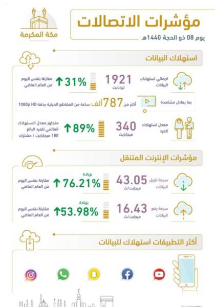 وتضمنت الإحصاءات الصادرة عن الهيئة معدل استهلاك الفرد اليومي للبيانات البالغ (340 ميجابايت/ مشترك)، متجاوزة معدل استهلاك الفرد اليومي العالمي للبيانات البالغ (180 ميجابايت/ مشترك) بنسبة 89%، مشيرة إلى أن أكثر التطبيقات استهلاكا للبيانات هي (يوتيوب، فيسبوك، سناب شات، واتساب، انستجرام).