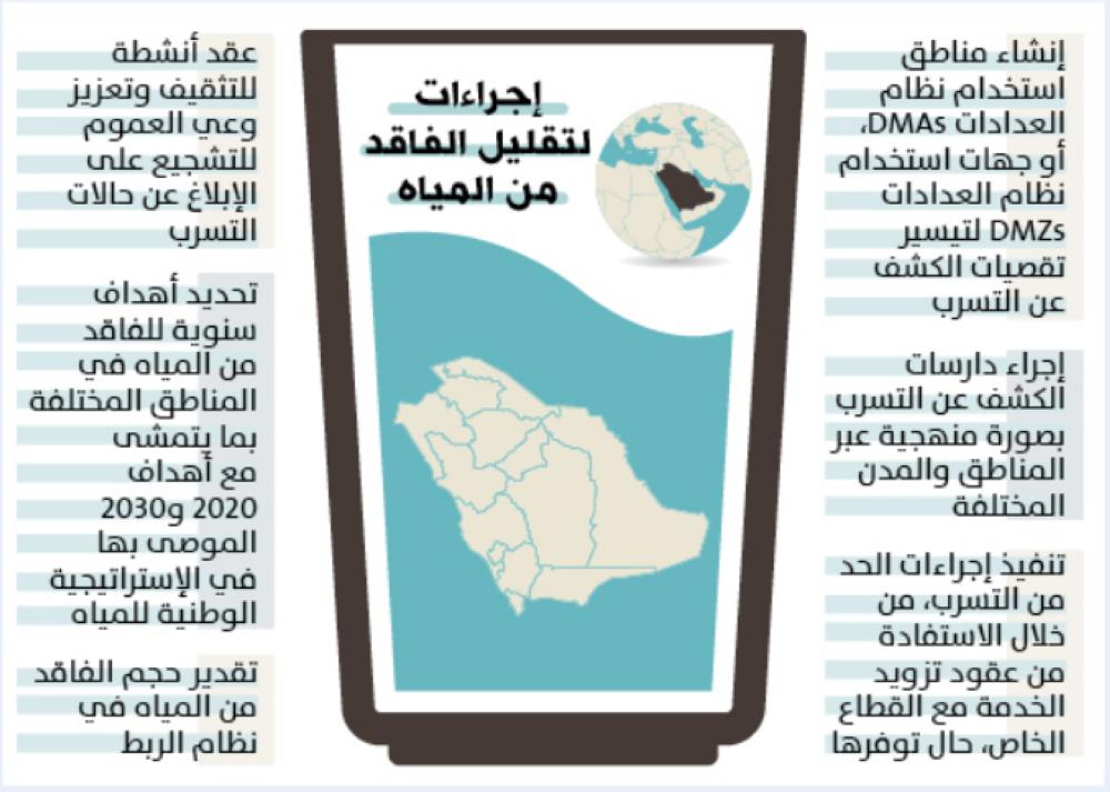أوضحت الوثيقة أن «مبادرة تخفيـض الفاقـد ومعالجـة الإمـداد غـير المنتظـم تهدف إلى تقديـر الفاقـد مـن الميـاه، وخفـض الميـاه المهـدرة إلى % بحلـول عـام 2030، ويتحقـق ذلك بتحسـين نـشر العـدادات، وممارســات إدارة الأصــول، وتحديــد مناطــق الضغــط وإدارته، وتشــمل هــذه المبــادرة أيضــا نـشر عـدادات قيـاس مسـتوى الميـاه في المناطـق للمسـاعدة في إدارة الضغـط وتحسـين جـودة الميـاه، واسـتمرار إمـداد الميـاه بحلـول عـام 2030».