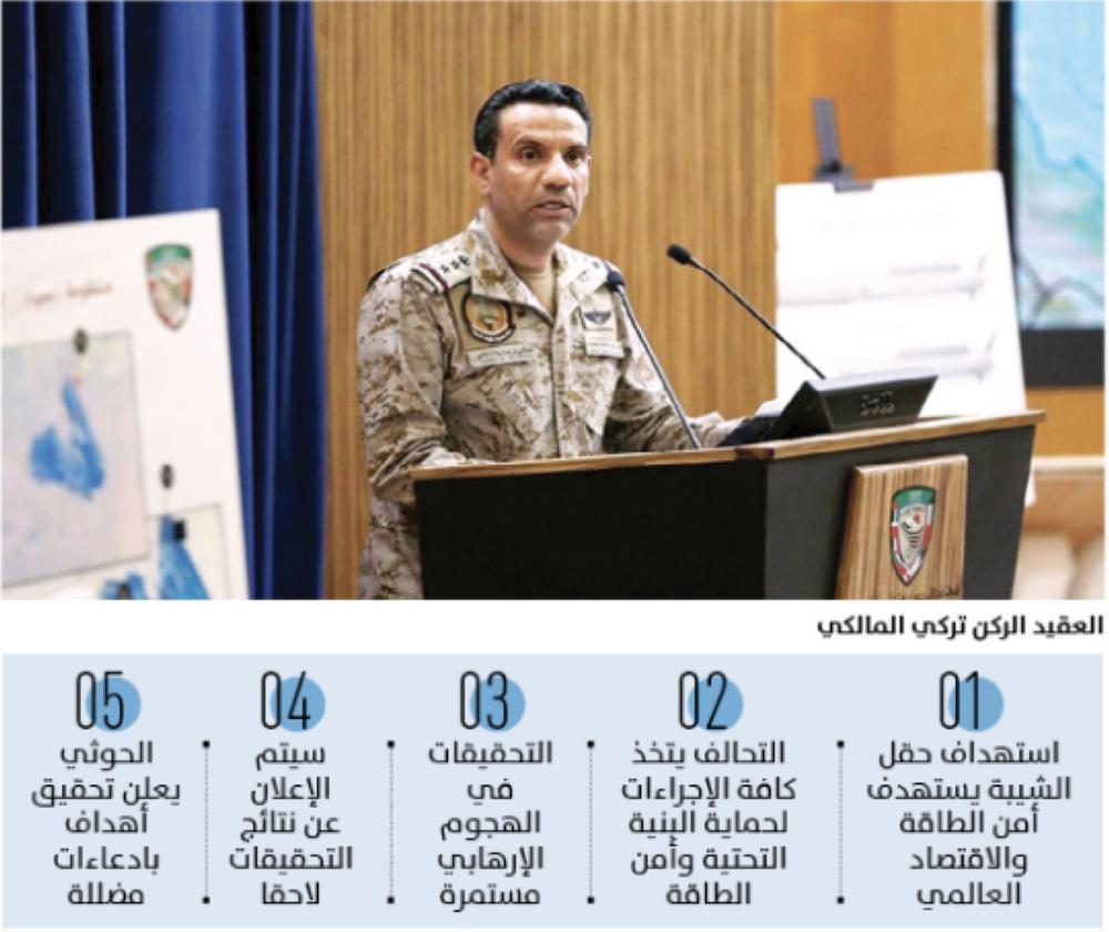 وأضاف المالكي في مؤتمر صحفي، أمس، أن الهجوم على حقل الشيبة النفطي لا يستهدف المملكة فقط، بل أمن الطاقة والاقتصاد العالمي، ونتخذ كافة الإجراءات الصارمة لحماية البنية التحتية والمنشآت للحفاظ على أمن الطاقة العالمي، وتابع "التحقيقات في هذا الهجوم الإرهابي مستمرة، وسيتم الإعلان عن نتائجها لاحقا"، لافتا "الميليشيات الحوثية تعلن تحقيق أهداف، ولكن هذه ادعاءات مضللة".