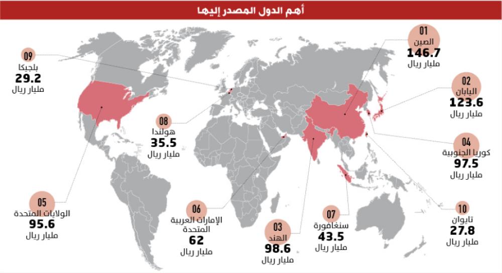 من أهم الدول التي صدرت إليها المملكة في 2018 دولة الصين، حيث حلت في المرتبة الأولى بقيمة مقدارها 146.7 مليار ريال ممثلة نسبة قدرها 13.3 % من إجمالي قيمة الصادرات وبارتفاع مقداره 4.3 مليارات وبنسبة 50.7 % عن العام السابق. وحلت اليابان في المرتبة الثانية بقيمة 123.6 مليار ريال، ثم الهند ثالثة بقيمة 98.6 مليار ريال.