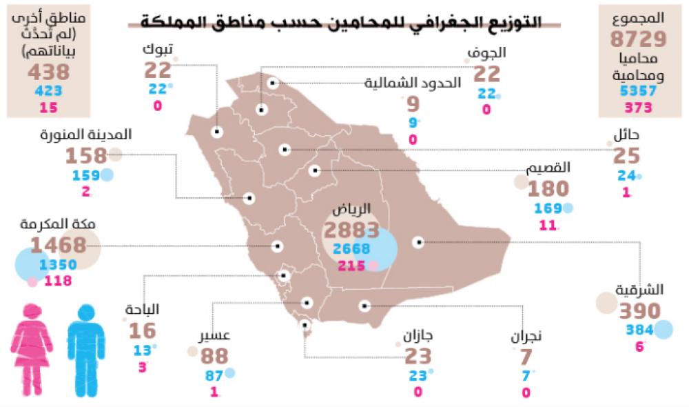 وأشارت الهيئة السعودية للمحامين إلى التوزيع الجغرافي للمحامين حسب مناطق المملكة منذ عام 1423-2002 حتى منتصف 1440-2018، حيث قدرت الهيئة إجمالي عدد المحامين والمحاميات السعوديين بـ8729 محاميا ومحامية من بينهم 5357 من الذكور مقابل 372 من الإناث.