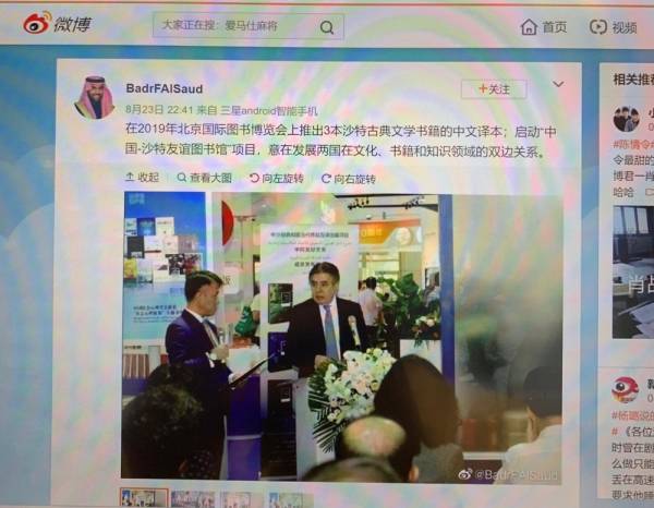 علق وزير الثقافة الأمير بدر بن عبدالله بن فرحان باللغة الصينية في موقع التواصل الاجتماعي الصيني الشهير ويبو مؤكداً أن «تدشين 3 كتب من الأدب الكلاسيكي السعودي مترجمة إلى الصينية في معرض بكين الدولي للكتاب 2019، انطلاقة لمشروع «مكتبة الصداقة الصينية السعودية» الذي يعنى بتطوير العلاقات الثنائية في مجالات الثقافة والكتاب والمعرفة». ووجد تعليق الوزير حفاوة واهتماما من المتابعين الصينيين.