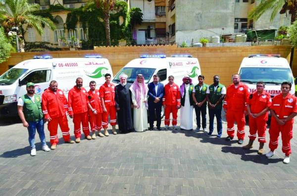 كما قدم المركز أمس ثلاث سيارات إسعاف مجهّزة بالمعدات الطبية إلى جمعية سبل السلام الاجتماعية التي ستقوم بتقديم مهمات إسعافية في مدينة المنية الشمالية وضواحيها، وذلك ضمن مشروع «دعم الخدمات والنقل الإسعافي في مناطق اللاجئين السوريين» في لبنان، وجرى التسليم في مقر سفارة المملكة ببيروت بحضور سفير خادم الحرمين الشريفين لدى لبنان وليد بن عبدالله بخاري، والنائب اللبناني عثمان علم الدين، ورئيس جمعية سبل السلام الاجتماعية الشيخ رسلان محمد ملص، وفريق المركز وعدد من أعضاء الجمعية والمسعفين والإعلاميين.