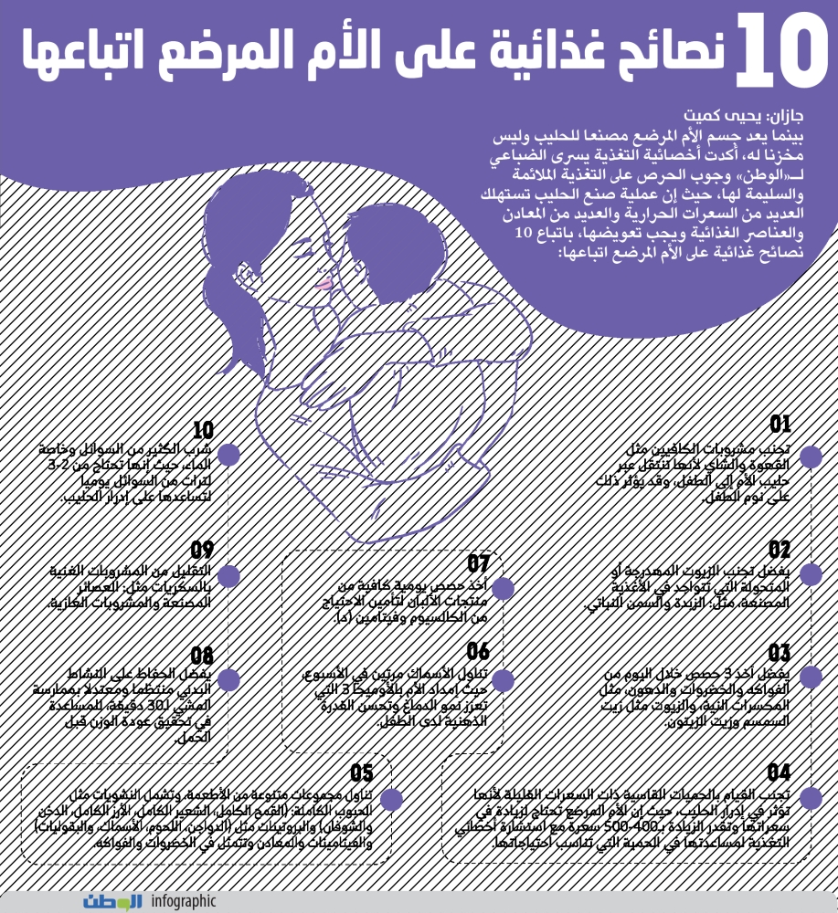 04 تجنب القيام بالحميات القاسية ذات السعرات القليلة لأنها تؤثر في إدرار الحليب، حيث إن الأم المرضع تحتاج لزيادة في سعراتها وتقدر الزيادة بـ400-500 سعرة مع استشارة إخصائي التغذية لمساعدتها في الحمية التي تناسب احتياجاتها.
