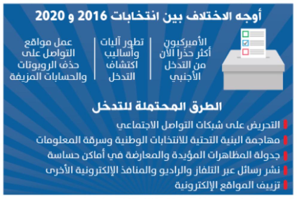 ربما لن يكون الأمر مشابها لما حدث في 2016، وأبرز الأسباب لذلك هو أن الأميركيين الآن أكثر حذرا من التدخل الأجنبي في الانتخابات، أما السبب الآخر فإن الآليات والأساليب الإلكترونية في الشبكات الأميركية بدأت في التطور بشكل كبير خصوصا في مواقع التواصل الاجتماعي، إذ باتت الأمور مراقبة بشكل أكبر.