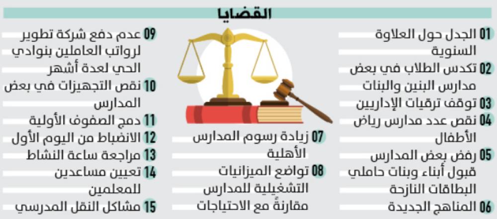 شهد الأسبوع الأول من العام الدراسي الجديد 15 قضيةً أثارت الجدل في الوسط التعليمي من أبرزها: ضوابط العلاوة السنوية التي أقرتها الوزارة في لائحة الوظائف التعليمية الجديدة ولا يزال الجدل حولها مستمرا منذ اعتماد اللائحة، وتواضع الميزانيات التشغيلية للمدارس مقارنةً مع الاحتياجات، ونقص عدد مدارس رياض الأطفال، وتكدس الطلاب والطالبات وتجاوز أعدادهم للطاقة الاستيعابية في بعض المدارس.