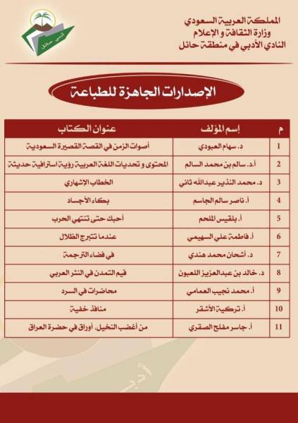 ونوه نائب رئيس النادي الأدبي الثقافي بحائل رشيد الصقري إلى حرص نادي حائل على أن تتزامن إصداراته مع معرضي الكتاب في جدة والرياض ليتيح للقراء اقتناء إصداراته المتنوعة ما بين السرد والشعر والدراسات الأدبية، كما يدعم الشباب بطباعة إنتاجهم وإقامة أمسيات للتحدث عن إصداراتهم، وأفاد الصقري بأن هناك حزمة من المخطوطات التي ستحكم وتصدر بعد هذه القائمة المعلن عنها.