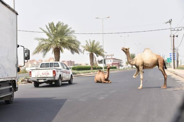 عمد بعض ملاك الجمال في جازان إلى ترك إبلهم سائبة للرعي في الجزر الوسطية بالطرق السريعة داخل المدن، وأصبحت تزاحم السيارات، فيما أكد تقرير لوزارة النقل أن عدد الحوادث التي تسببت فيها الجمال السائبة بالمملكة العام الماضي بلغ 355 حادثا. (تصوير: يحيى مدخلي)
