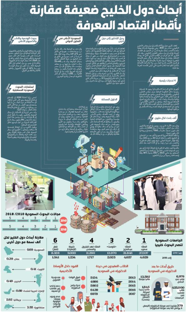 وتمتلك المملكة العربية السعودية أكبر عدد من الباحثين في الخليج، لكنها تحتل المرتبة 52 من بين 134 دولة وفقا لمؤشر المعرفة العالمي، حيث يلعب طلاب الدكتوراه والماجستير دورا رئيسيا في الأداء البحث داخل الجامعات.