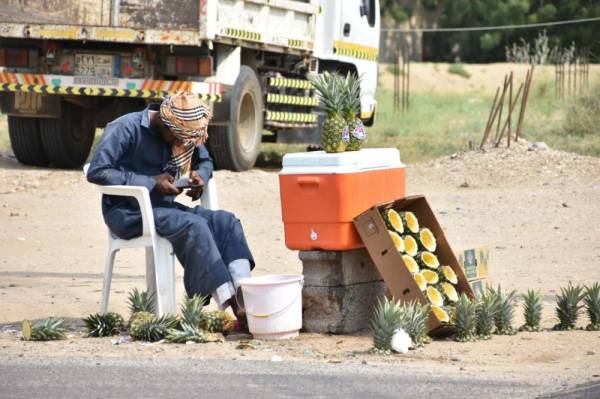 بعد انتهاء موسم اللوز والفل الذي يستغله الباعة الجائلون المخالفون في منطقة جازان، انتشرت العشرات من بسطات بيع الأناناس على الطرق.. وفي الصورة بائع يطالع هاتفه المحمول في انتظار الزبائن. (تصوير: يحيى مدخلي)