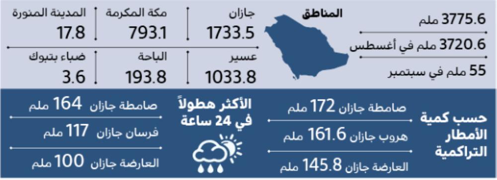 بحسب التقرير، جاءت صامطة التابعة لمنطقة جازان الأكثر في كمية المطر خلال 24 ساعة، حيث بلغت 164 ملم، تلتها مدينة فرسان كذلك من منطقة جازان بـ117 ملم، ثم العارضة من جازان بـ100 ملم، فيما حلت كذلك صامطة في مقدمة مدن المملكة حسب كمية الأمطار التراكمية حيث بلغت 172 ملم، ثم محافظة هروب بمنطقة جازان 161.6 ملم.