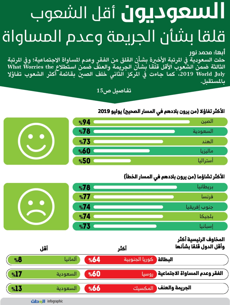 78 % من السعوديين بمستقبل بلادهم، وذلك في الاستطلاع الذي هدف لمعرفة أكثر الموضوعات التي تثير قلق الشعوب في بلدانها، وشمل عينة من مواطني 28 دولة، بعنوان «ماذا يقلق العالم في يوليو 2019».