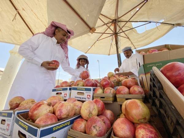 عاد الرمان اليمني إلى الأسواق السعودية بعد رفع حظر استيراده، وفي الصورة مواطن من نجران يشتري الرمان من أحد الباعة في السوق المركزي أمس. (تصوير: أحمد بالحارث)
