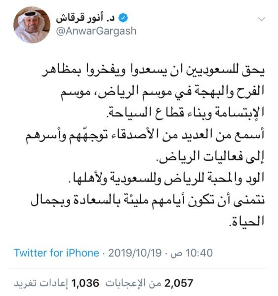 عبر سفير السعودية لدى الإمارات تركي الدخيل عبر حسابه في تويتر قائلا: «الآن يمكن أن يغني الجميع: آه ما أرق الرياض تالي الليل». كما قال وزير دولة الإمارات للشؤون الخارجية الدكتور أنور قرقاش: «يحق للسعوديين أن يسعدوا ويفخروا بمظاهر الفرح والبهجة في موسم الرياض، موسم الابتسامة وبناء قطاع السياحة. أسمع من العديد من الأصدقاء توجهّهم وأسرهم إلى فعاليات الرياض. الود والمحبة للرياض وللسعودية ولأهلها. نتمنى أن تكون أيامهم مليئة بالسعادة وبجمال الحياة».