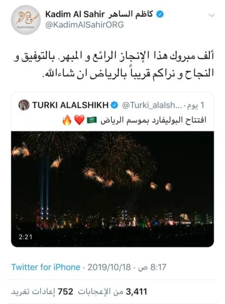 بارك رئيس الاتحاد الآسيوي للصحافة الرياضية سطام السهلي للشعب السعودي فقال: «مبروكين أهل المملكة وأهل الرياض خاصة هذا الإنجاز #موسم_الرياض وبالتوفيق والنجاح إن شاء الله». دعا الشاعر السعودي عبداللطيف آل الشيخ باستمرار الفرح والسعادة عبر حسابه في تويتر: «اللهم أدم علينا نعمة الفرح والسعادة والأمن والأمان واحفظ #السعودية واحفظ ملكها #الملك_سلمان_بن_عبدالعزيز و #ولي_العهد الأمير #محمد_بن_سلمان وجيشها العظيم وشعبها الوفي وكل شبر من أرضها الطاهرة».