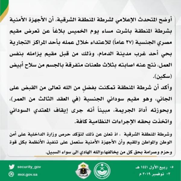 وأكد المتحدث الإعلامي، أن الأجهزة الأمنية تمكنت من القبض على المعتدي، وبحوزته أداة الجريمة، وجرى إيقافه واتخاذ الإجراءات النظامية.
