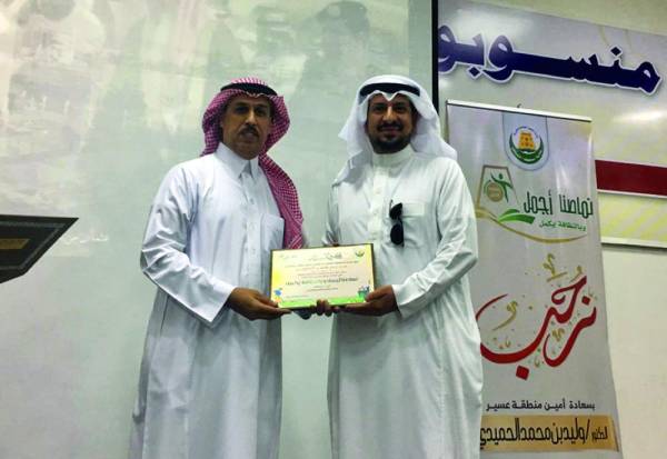 كرم نائب رئيس بلدية النماص عبدالرحمن الشهري، محرر «الوطن»، بدر الطنيني، والمصور صالح الجبيري على تعاونهما الإعلامي في إنجاح مبادرة «نماصنا أجمل وبالنظافة يكمل» التي استمرت 5 أيام بمشاركة 7 بلديات.