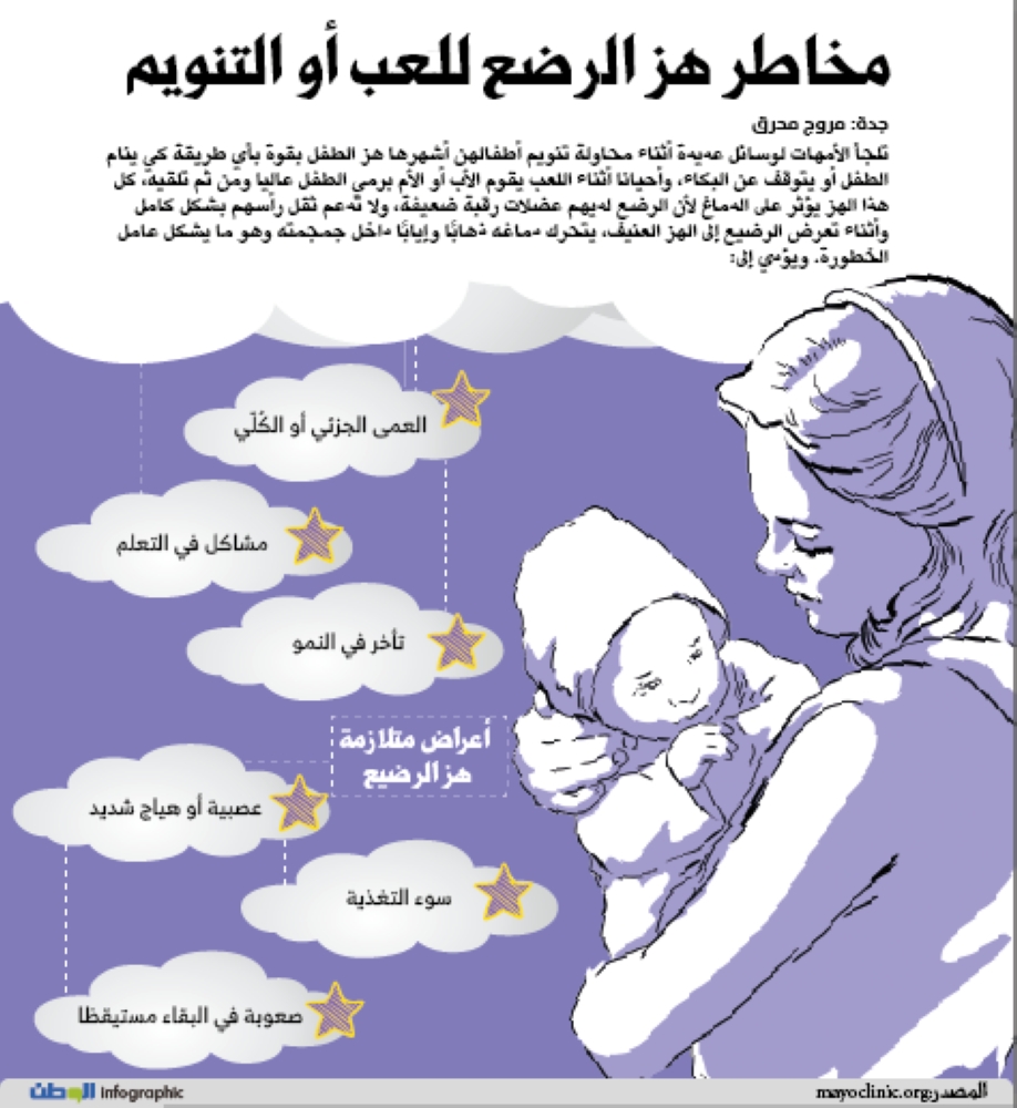 تلجأ الأمهات لوسائل عديدة أثناء محاولة تنويم أطفالهن أشهرها هز الطفل بقوة بأي طريقة كي ينام الطفل أو يتوقف عن البكاء، وأحيانا أثناء اللعب يقوم الأب أو الأم برمي الطفل عاليا ومن ثم تلقيه، كل هذا الهز يؤثر على الدماغ لأن الرضع لديهم عضلات رقبة ضعيفة، ولا تدعم ثقل رأسهم بشكل كامل وأثناء تعرض الرضيع إلى الهز العنيف، يتحرك دماغه ذهابًا وإيابًا داخل جمجمته وهو ما يشكل عامل الخطورة.