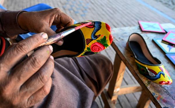 يعمل الفنان الباكستاني فريد أحمد على حذاء «خصص» التقليدي، لبيعه في متجر بإسلام أباد. (أ ف ب)
