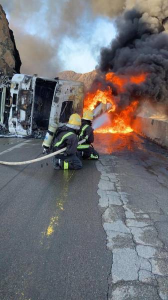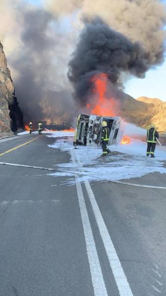 أخمد مدني ضباء حريقا اندلع في ناقلة وقود صهريج بعد انقلابها وتسرب حمولتها بنزين، مما نتج عن الحادث إصابة سائق الناقلة، وأوضح نائب المتحدث الإعلامي ملازم أول رافع العمري، تبلغ مركز التحكم والتوجيه في إدارة الدفاع المدني بمحافظة ضباء عن حريق ناقلة وقود صهريج على طريق تبوك، ويبعد 10 كيلومترات تقريبا عن المحافظة، وفور تلقي البلاغ تم تحريك الفرق اللازمة والمختصة، مشيرا إلى أن الحادث عبارة عن انقلاب، مما أدى إلى تسرب الوقود واشتعالها، مبينا أنه تم تأمين الموقع وإخماد الحريق، ونتج عن الحادث إصابة سائق الناقلة، وهو من الجنسية الهندية، وتم نقله بواسطه الهلال الأحمر وحالته الصحية مستقرة.