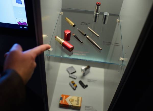 مقتنيات في معرض «الجاسوس الألماني» الذي أعيد بناؤه وهي مسدسات أحمر الشفاه وميكروفونات القلم المستخدمة في تكنولوجيا الاتصالات في ذلك الوقت. (د ب أ)