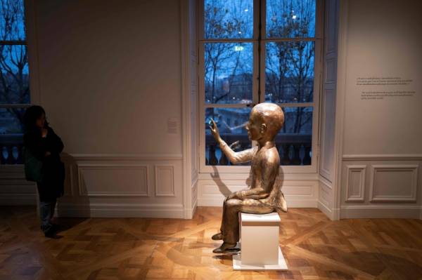 زائرة تنظر لتمثال من صنع الفنان كيكي سميث بعنوان «البشارة» في متحف موناي دي باريس في فرنسا .(أ ف ب)