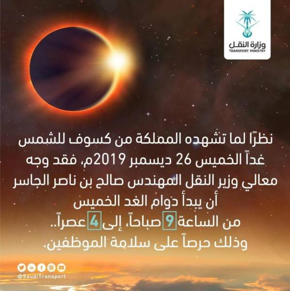 ‏وجه وزير النقل المهندس صالح الجاسر، بتأخير بدء الدوام، ليوم غدٍ الخميس إلى الساعة 9:00 صباحاً، وذلك حرصاً على سلامة منسوبي ⁧‫#وزارة_النقل‬⁩، ولتزامن ⁧‫#كسوف_الشمس‬⁩ مع أوقات خروجهم من المنازل.