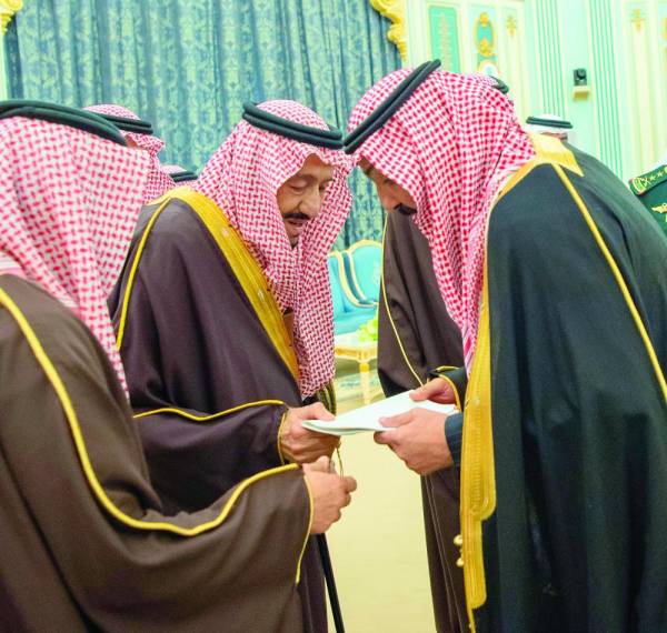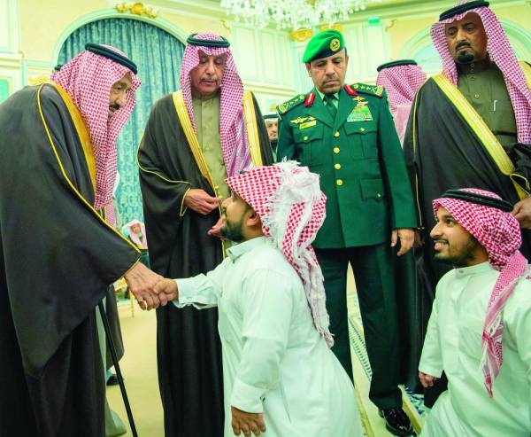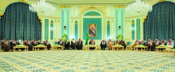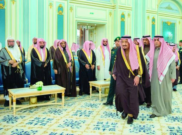 وفي بداية الاستقبال، أنصت الجميع لتلاوة آيات من القرآن الكريم، ثم تشرف الحضور بالسلام على خادم الحرمين الشريفين.