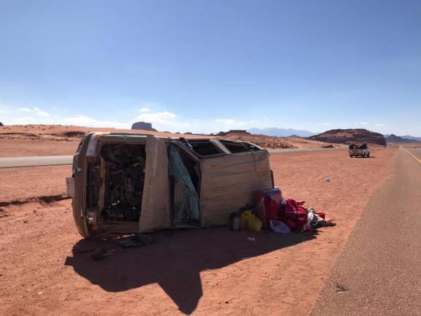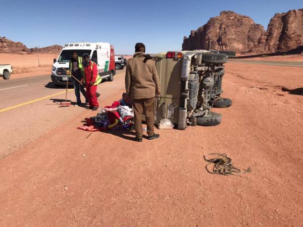 باشرت فرق الهلال الأحمر بمنطقة تبوك أمس بلاغا عن 7 إصابات، ثلاث منها خطيرة وثلاث إصاباتها مستقرة وحالة وفاة. وأوضحت هيئة الهلال الأحمر بمنطقة تبوك أن غرفة العمليات تلقت بلاغا عند الـ13:26 عن حادث انقلاب مركبة على طريق شرما قبل مفرق بجدة وعلى الفور تم توجيه 6 فرق إسعافية للموقع من الهلال الأحمر، وعند مباشرة أول فرقة إسعافية للموقع وبعد إتمام عملية الفرز الطبي اتضح وجود 7 إصابات في الموقع، وتم التعامل إسعافيا مع الإصابات ونقلهم جميعا إلى مستشفى الملك فهد التخصصي والملك خالد.