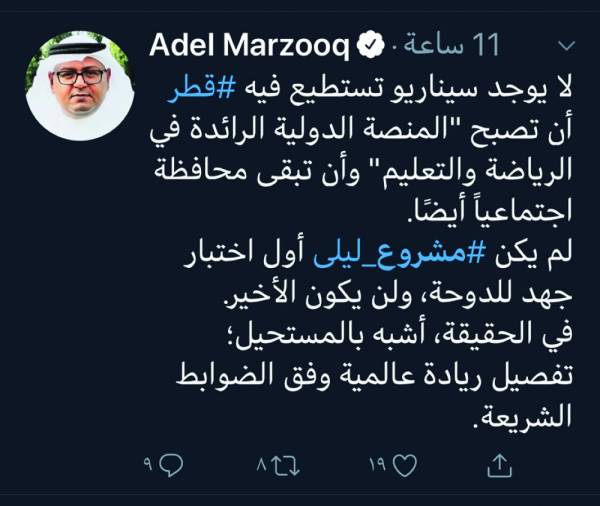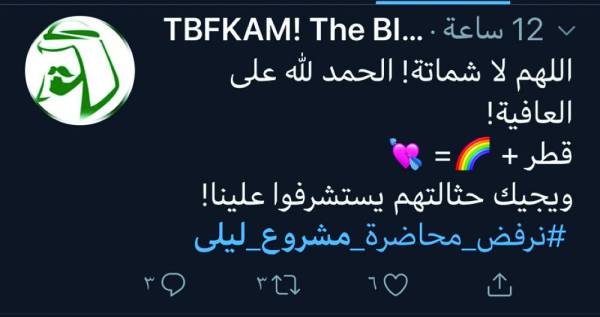 بدوره سعد الحمادي قال: «في الآونة الأخيرة بدأنا نلاحظ عدة هجمات وتعديات على هوية المجتمع القطري ومعتقدات دينية ورثناها جيلاً عن جيل! كان آخرها المحاضرة التي ستقيمها فرقة مشروع ليلى بعد أيام في الجامعة.. إلى متى هذا التمادي يا ترى ومن المسؤول!!!».