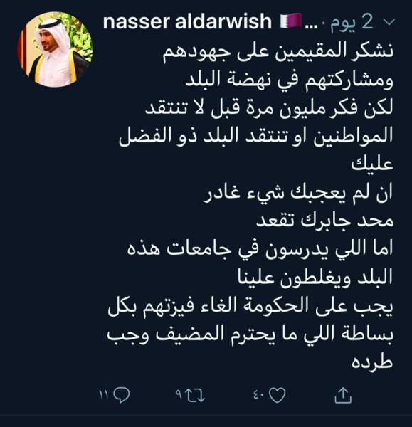 وقال أيضا: «نشكر المقيمين على جهودهم ومشاركتهم في نهضة البلد، لكن فكر مليون مرة قبل أن تنتقد المواطنين أو تنتقد البلد ذا الفضل عليك، إن لم يعجبك شيء غادر، محد جابرك تقعد، أما إللي يدرسون في جامعات هذا البلد ويغلطون علينا؛ يجب على الحكومة إلغاء فيزهم بكل بساطة اللي ما يحترم المضيف وجب طردهم».