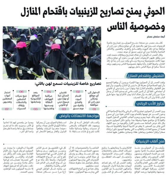 وفيما كانت «الوطن» حصلت على معلومات تم نشرها في حينه حول هذه الحقائق التي تم مؤخرا عرضها في تقرير الأمم المتحدة، إلا أن هناك ممارسات أخرى استهدفت بها الزينبيات العديد من الأسر والنساء في صنعاء، وقمن خلالها بأدوار انتهاكية كبيرة لحقوق النساء، وابتزازهن بالصور والمقاطع وتهديد كرامتهن والرشف والعرض، فضلاً عن إخضاعهن لتنفيذ التوجيهات والمطالب.